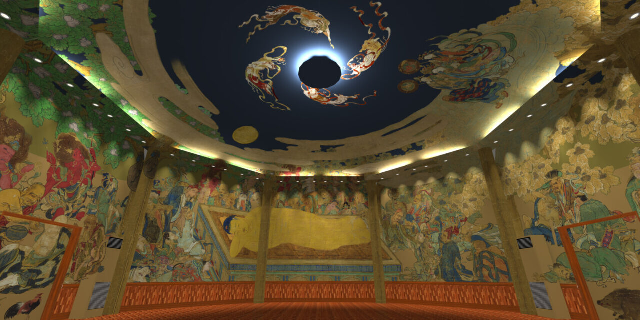 お釈迦様がお亡くなりになった時の様子を描いたものを涅槃図といいます。 この御堂の涅槃図は南北朝時代(650年前)に描かれた高台寺所蔵の八相涅槃図を最先端技術を駆使し、完成させました。